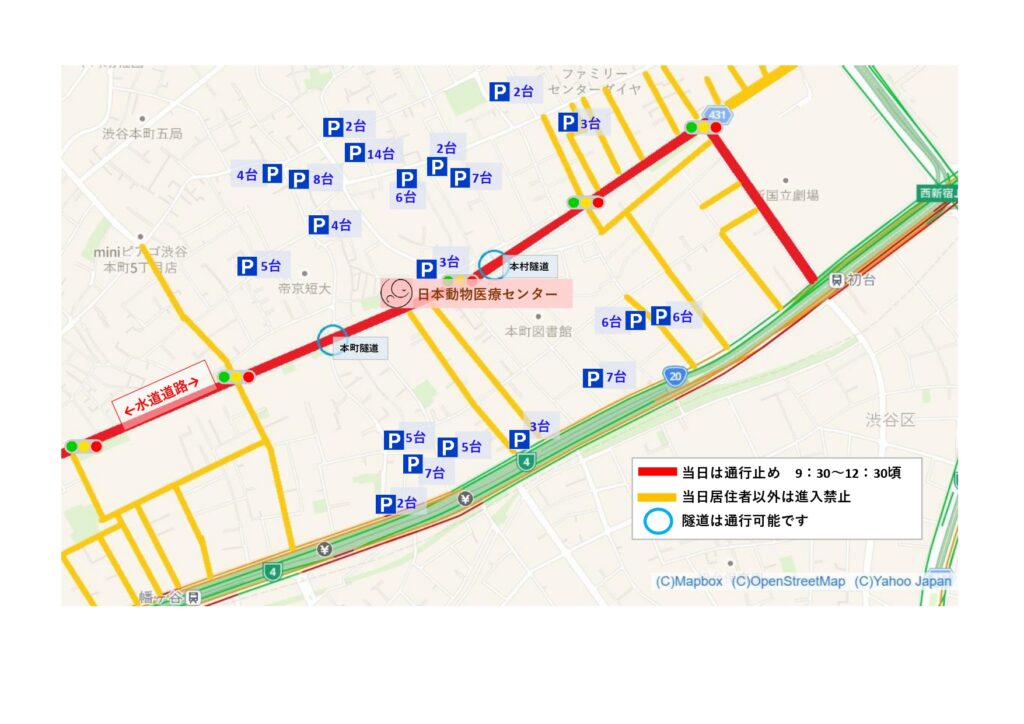 そちらに際しまして、当院の前面道路である水道道路、付随する道路が 9:30~12:30 に車両通行止めとなり、当日午前中はお車、バス、タクシー等でのご来院が困難となります。