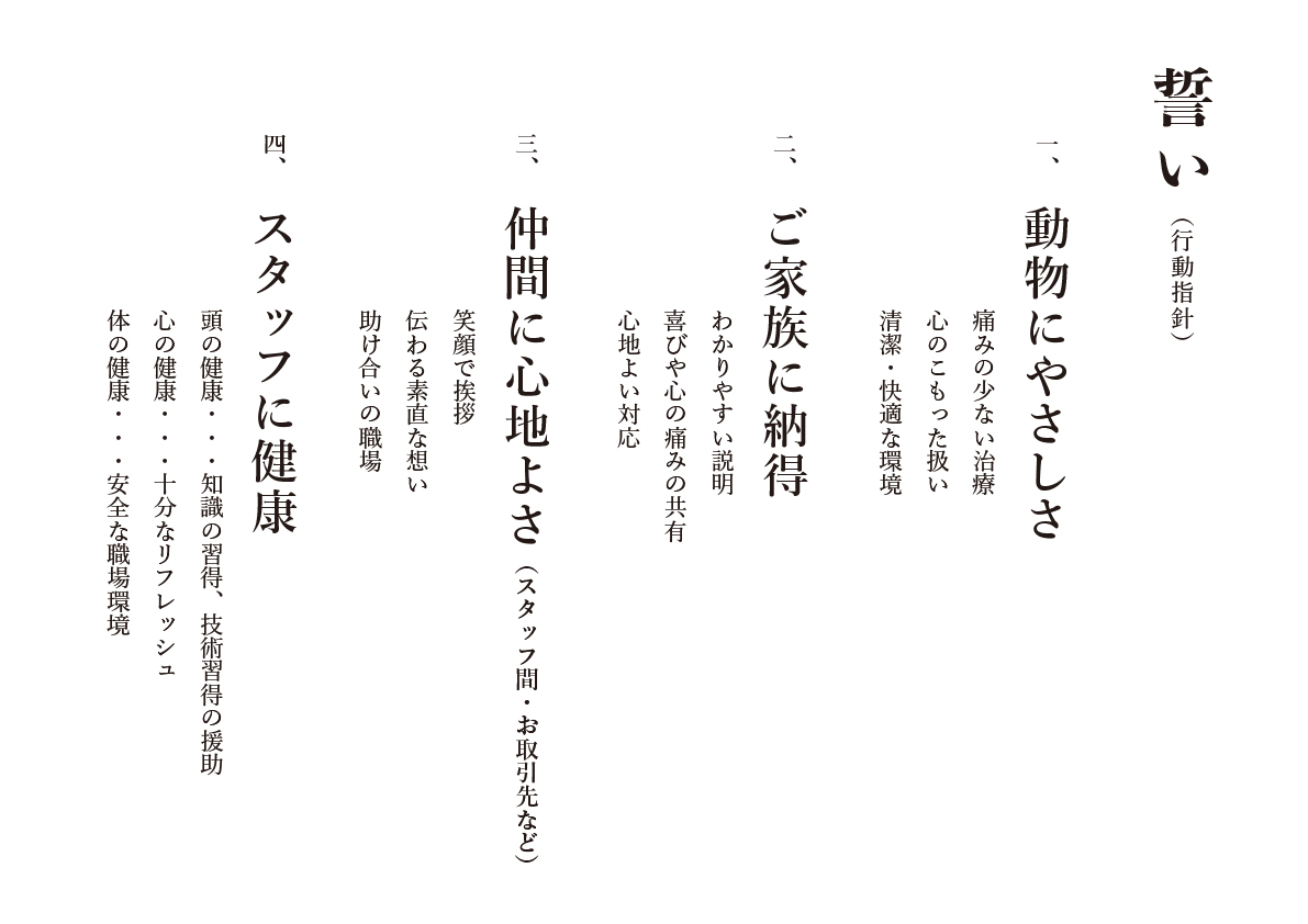 経営デザイン認証とは、公益社団法人⽇本⽣産性本部経営品質協議会が、「経営デザインによる⽣産性向上プログラム」の⼀環として2018年より新たに創設した認証制度です。認証を受けようとする企業(病院)が作成した「これからの経営設計図」を第三者が⾯談等のやりとりから、アドバイスやフィードバックの⽀援を⾏い、その上で経営デザイン認証委員会で書類・⾯接による審査を⾏い、⼀定レベルに達した組織を認証するものです。当院は、ランクアップ認証(2019〜2020年度)を動物病院として初めて取得しました。定期的に経営品質向上会議を通し、当院理念の浸透を図ります。また、将来を見据えた改善案を社員全体で定期的に話しあい、現場と経営層が同じ目線で取り組むべき課題を設定し、理念の実現に引き続き邁進します。