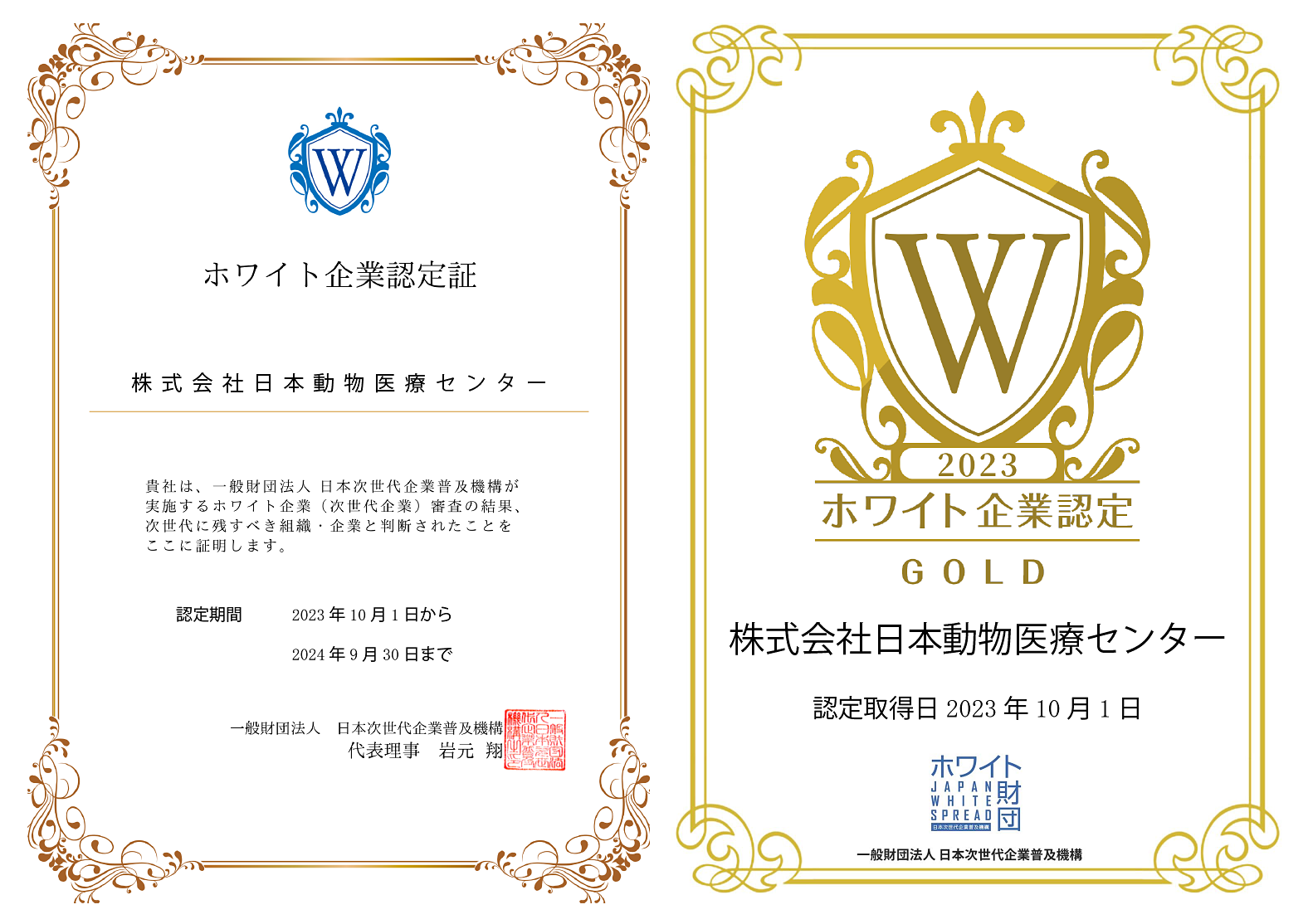 ホワイト企業認定とは、一般財団法人日本次世代企業普及機構が、“次世代に残すべき素晴らしい企業”をホワイト企業認定によって取り組みを評価・表彰する組織です。ホワイト企業の要件について、70の設問が用意され、総合的に判断・評価をしています。当院でも働き方改革を実践しています。時間外労働を減らし、かつ効率を上げるシステムシステムづくりを日々模索しています。動物病院として初めて日本次世代企業普及機構よりホワイト企業として認定されました(2020年)。2022年には新たに設定された5つの認定ランクの内、上から2つ目のゴールド認定を獲得し、動物病院業界内唯一の認定企業となりました。そして続く2023年もゴールド認定を獲得しておりますが、今後も来院されるご家族様や動物たちに継続して安心を提供するために、健全な経営および労働環境を探求し続けてまいります。