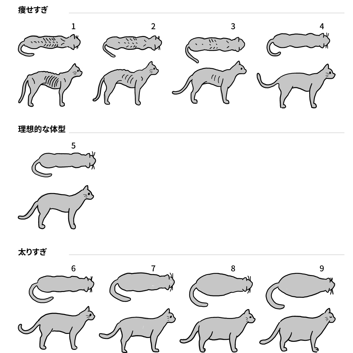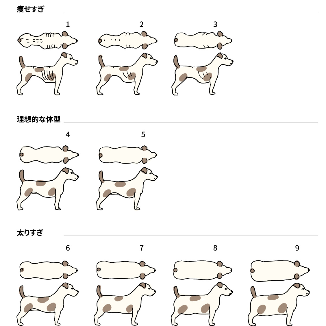 1.短毛種で肋骨が見える。体脂肪が触知できない。著しい腹部のへこみ。腰椎および腸骨がはっきりと見えており容易に触知できる。 2.短毛種で肋骨が容易に見える。筋肉量がごくわずかであり腰椎がはっきりと見える。腹部のへこみが顕著である。体脂肪が触知できない。 3.ごく薄い体脂肪が肋骨を被っており、容易に触知できる。腰椎がはっきりと見える。肋骨の後ろに腰がはっきりとくびれている。腹部の体脂肪はごくわずか。 4.ごく薄い体脂肪が肋骨を被っており、触知できる。肋骨の後ろに腰がくびれているのが見える。腹部のくびれはわずか。腹部の脂肪層がない。