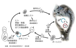 前述のとおり、トキソプラズマはほとんどの哺乳類・鳥類に感染しますが、猫科動物以外の動物の体の中ではトキソプラズマは自分を包む袋を作って筋肉の中に潜んでいます。もし人間にうつるとするならば、感染動物の肉を生で食べた場合だけです(感染経路③)。ただしネコ科動物はトキソプラズマの卵のようなもの=オーシストを糞便の中に排泄します。このオーシストは一般的な消毒薬では殺すことができませんし、非常に丈夫なため土の中で数か月にわたって感染能を持ち続けます。これが感染源となってしまうわけです。(感染経路②)。猫と他の動物ではこういった違いがあるため、トキソプラズマ症においては特別な対応が必要になるわけです。