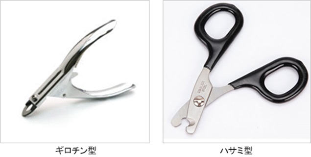 代表的なものとして、ギロチン型、ハサミ型の2種類があります。動物病院やトリミングサロンでは主にギロチン型のものを使用しています。 ギロチン型のものは非常にキレが良く、爪切りが早く終わります。爪切りは猫がイライラする前に終わらせたいので、扱いに慣れている動物病院スタッフはこちらを使うことが断然多いです。初心者さんにとっては、非常にキレがいいのと使い慣れない形をしているため、意図せず深爪をさせてしまうことがあるので、まずはハサミ型から始めるのがいいかもしれませんね。