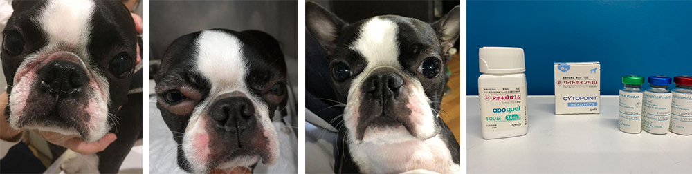 アレルギーは正常な個体であれば反応しないものにまで、体が過敏に反応し、皮膚に炎症や痒みを引き起こす疾患です。 アレルギー性皮膚炎は、ハウスダスト、植物や化学物質などの環境アレルゲンに起因する「アトピー性皮膚炎」と食物アレルゲンに起因する「食物アレルギー」が一般的です。他に、寄生虫であるノミがアレルゲンとなる「ノミアレルギー」もあります。 アレルゲンによって治療法は異なりますが、痒みが出た場合は、まずは「ノミアレルギー」の除外も含む治療として駆虫薬を使用します。他に痒みを誘起する原因がないか探すべく、皮膚検査、血液検査や除去食試験などの検査を行い、診断をつけます。「アトピー性皮膚炎」の治療は痒み、炎症を抑える対症療法と、皮膚のバリアー機能を改善を目的としたシャンプー療法、サプリメントや保湿剤になります。また、アレルギーの原因物質(抗原)を少しずつ投与し、抗原に慣らすといった減感作療法もあります。「食物アレルギー」の治療は痒みや炎症に対する治療をしつつ、アレルゲンとなる食品を避けた食事療法が治療になります。