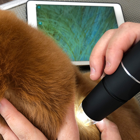 施術前に皮膚や被毛の状態もマイクロスコープを使って確認させていただきます。モニタリングの結果を踏まえ、メニューのご提案、また、オーナー様からのご希望をお伺いし、当日の施術内容を決めていきます。(所用時間20分程度)